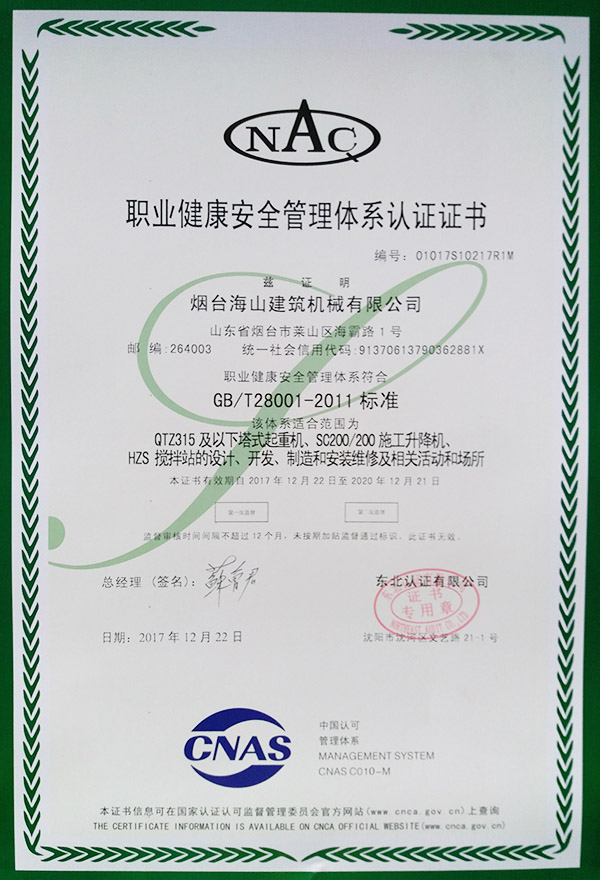 職業(yè)健康安全管理體系認證證書